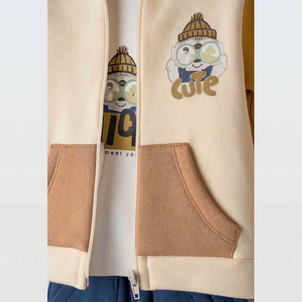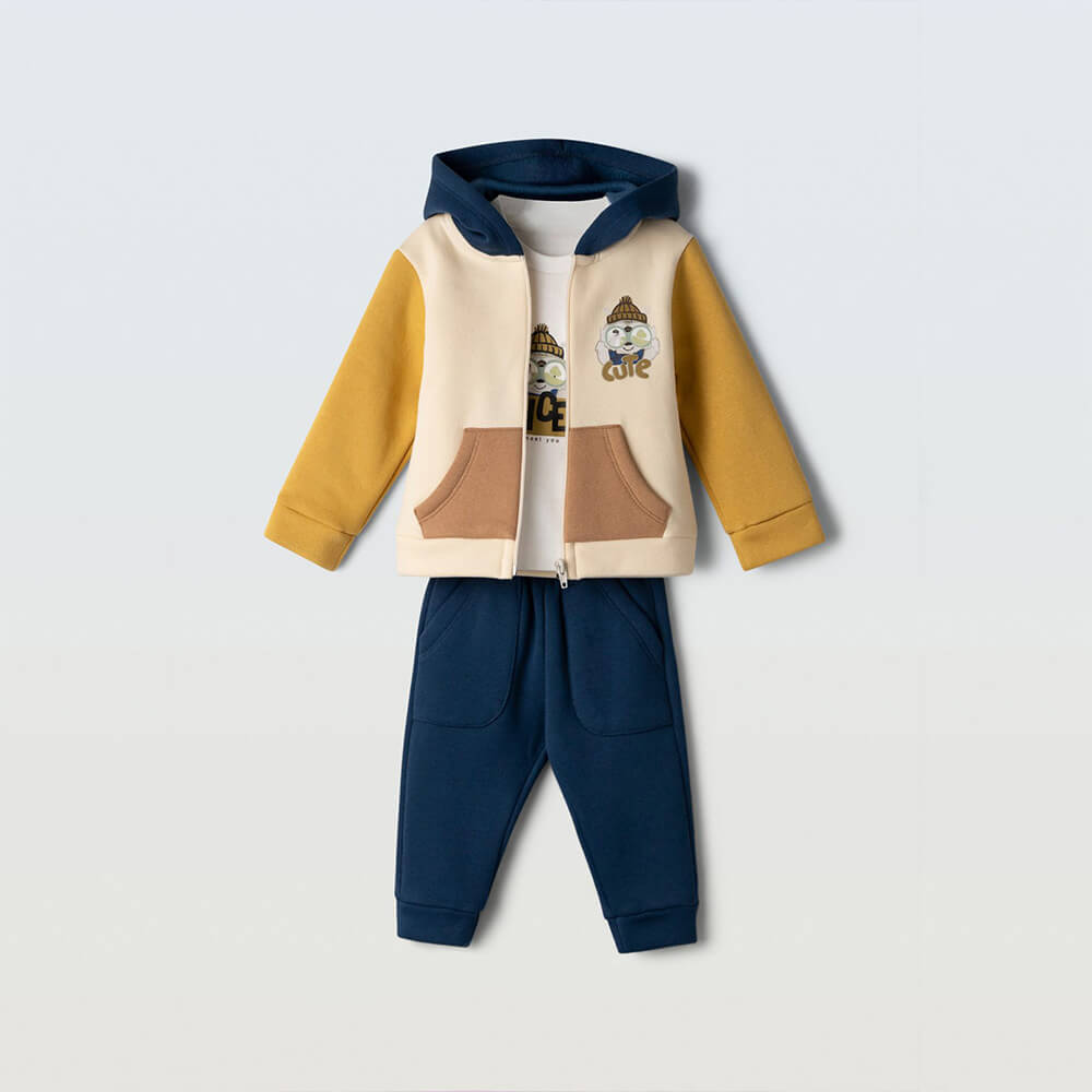 Το σετ “Cute Bear” είναι η ιδανική επιλογή για τους μικρούς μας φίλους που θέλουν άνεση και στυλ! Περιλαμβάνει μακρυμάνικη ζακέτα με κουκούλα σε μπεζ, μουσταρδί και καφέ αποχρώσεις, διακοσμημένη με παιχνιδιάρικη στάμπα αρκουδάκι και το λογότυπο “Cute”. Συνδυάζεται άψογα με μπλουζάκι με matching σχέδιο και άνετο μπλε παντελόνι φόρμας με λάστιχο και τσέπες.
