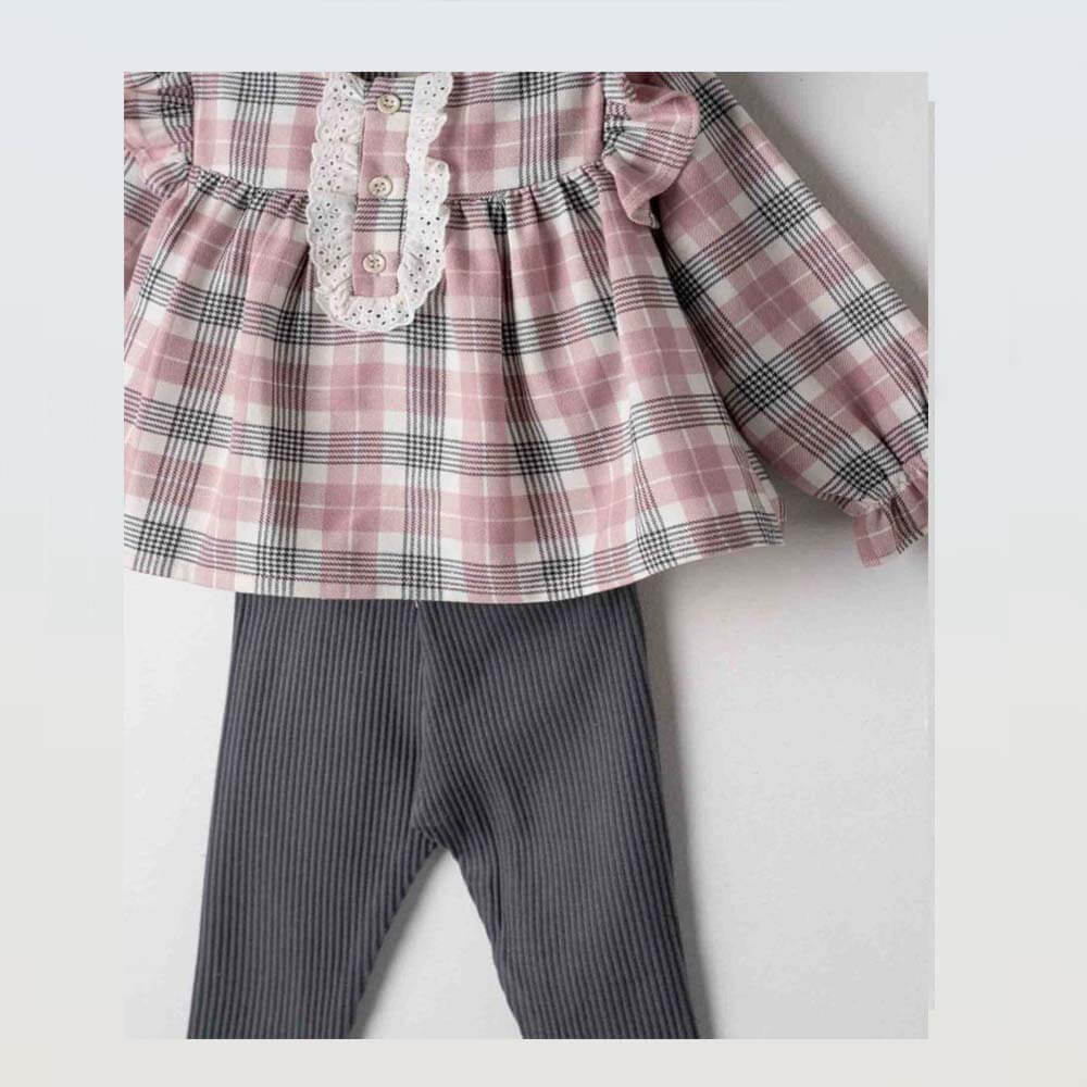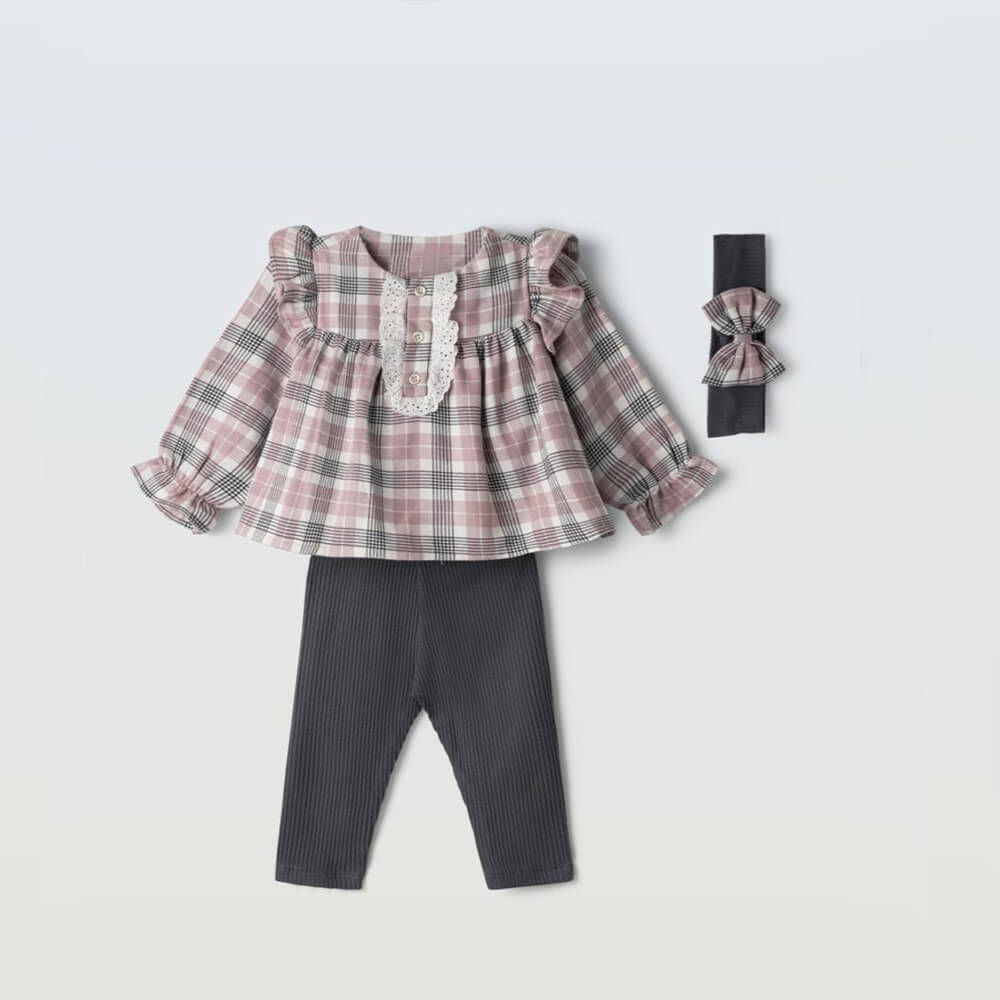 Το σετ “Plaid Charm” προσφέρει τον ιδανικό συνδυασμό άνεσης και κομψότητας για τις μικρές fashionistas. Αποτελείται από καρό μακρυμάνικη μπλούζα με διακοσμητικά βολάν στους ώμους και λευκή δαντελένια λεπτομέρεια με κουμπιά στο στήθος. Συνοδεύεται από ριμπ κολάν σε σκούρο γκρι και ασορτί στέκα με φιόγκο. Ένα ρομαντικό και στιλάτο outfit για όλες τις ώρες!