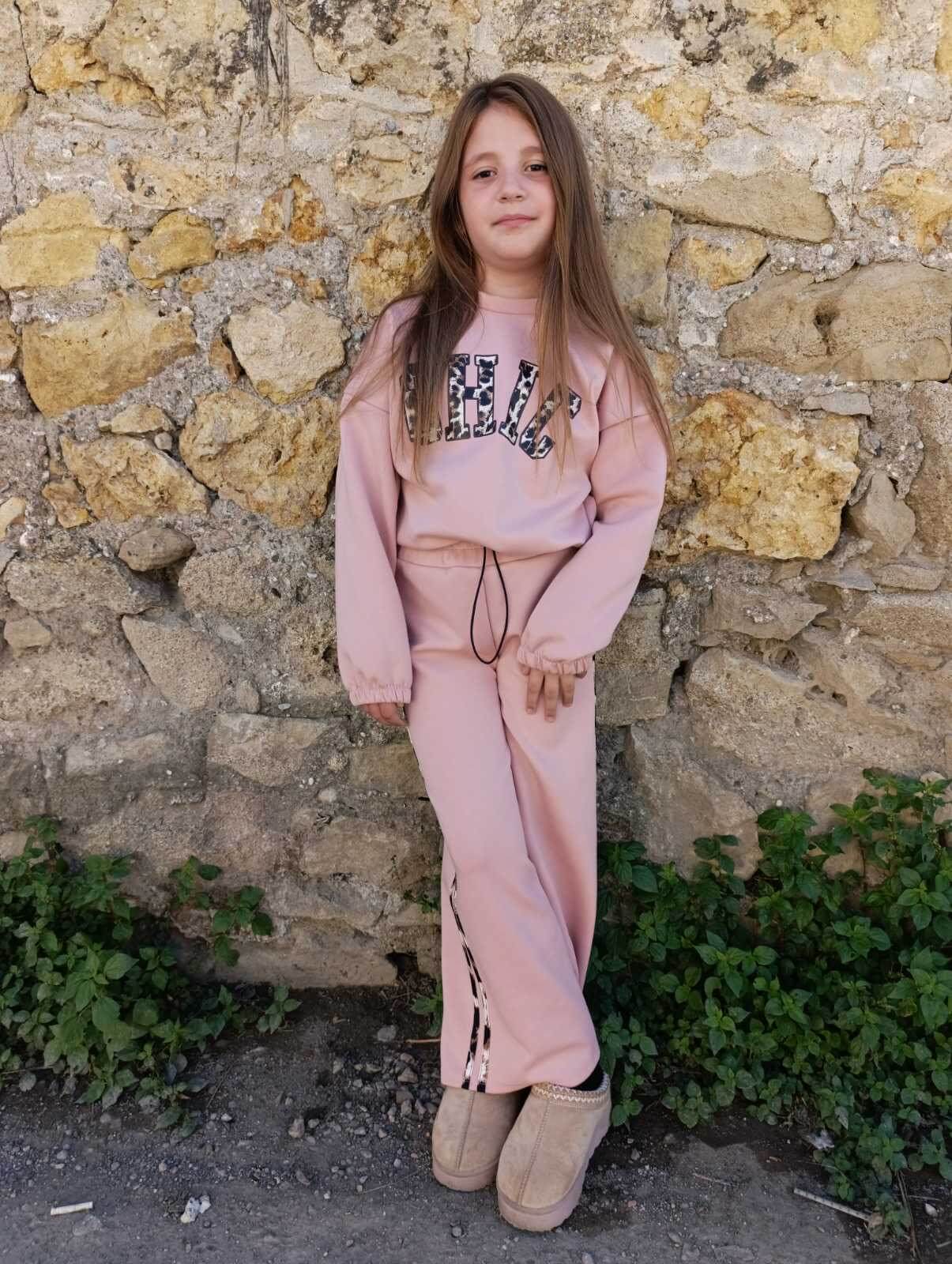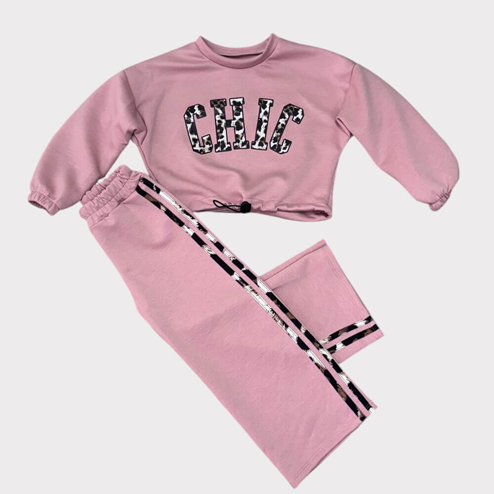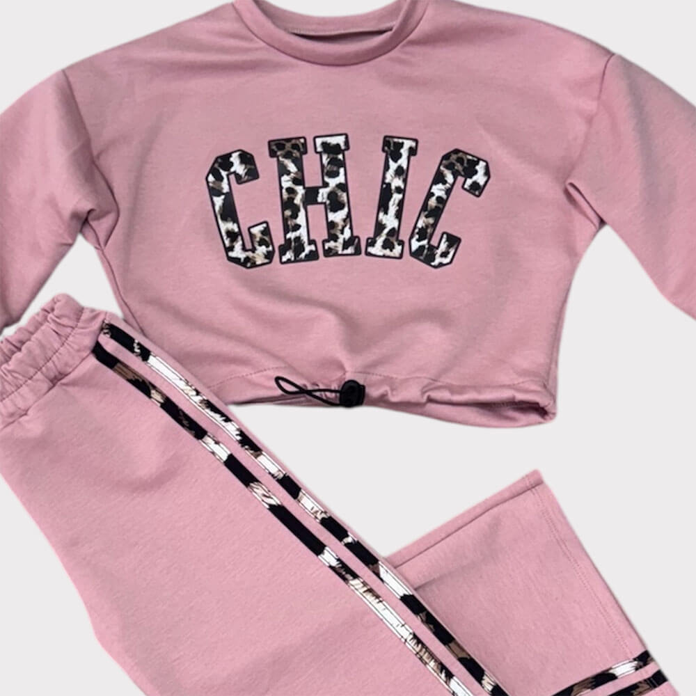 Παιδικό σετ φόρμας κορίτσι σε ροζ απόχρωση με cropped φούτερ “CHIC” και άνετο παντελόνι με ρίγα στο πλάι. Τέλειο για σχολείο και παιχνίδι.