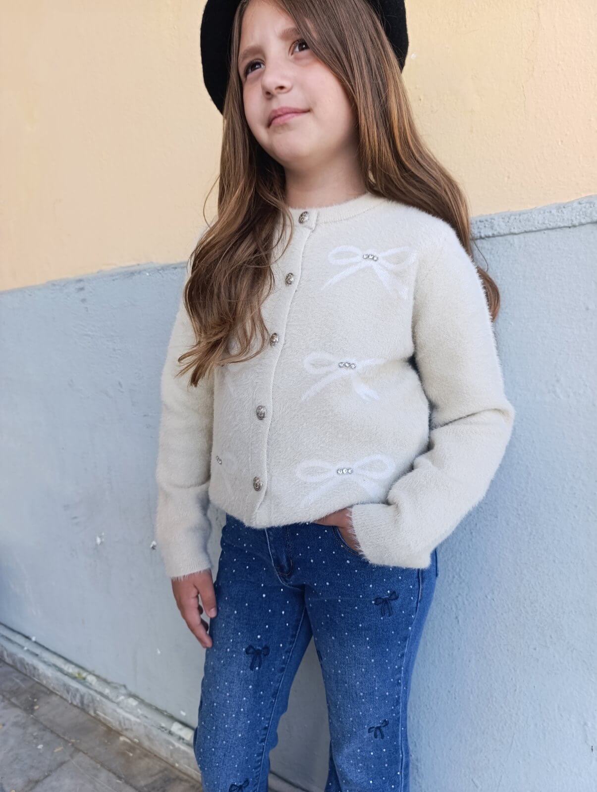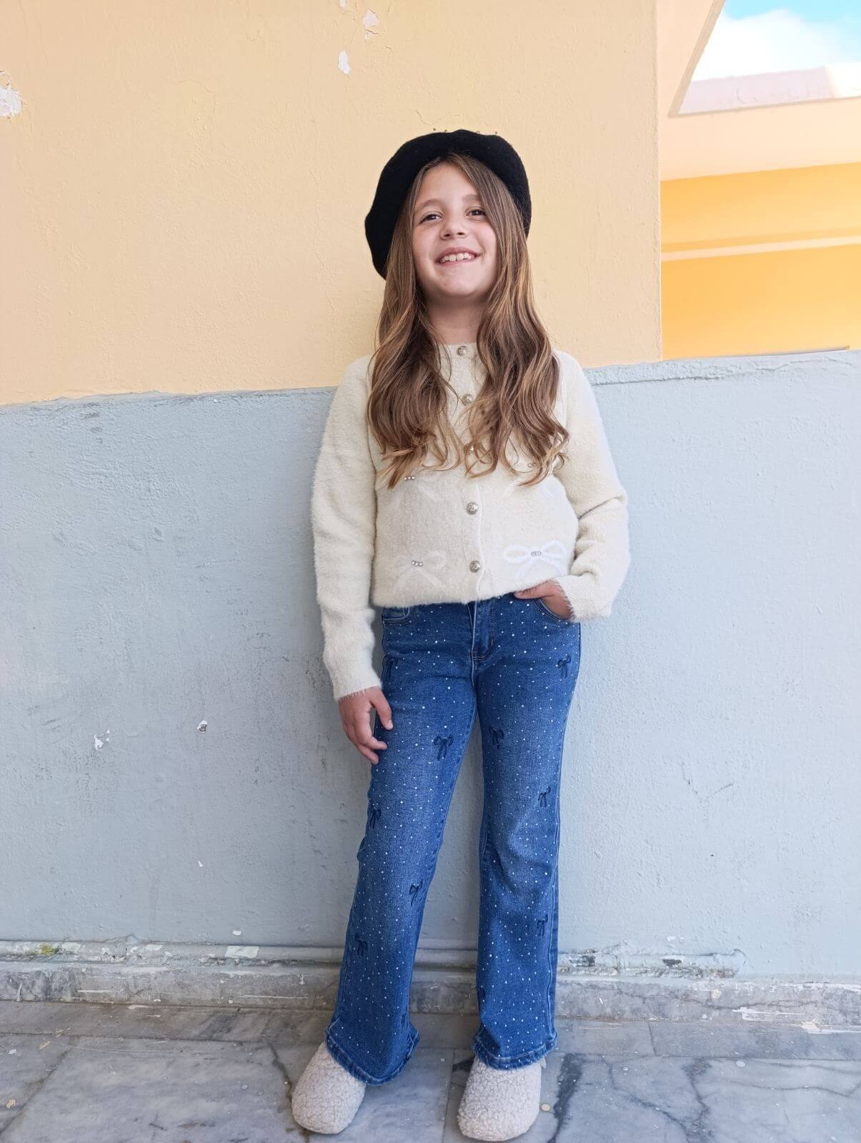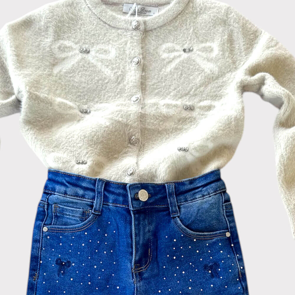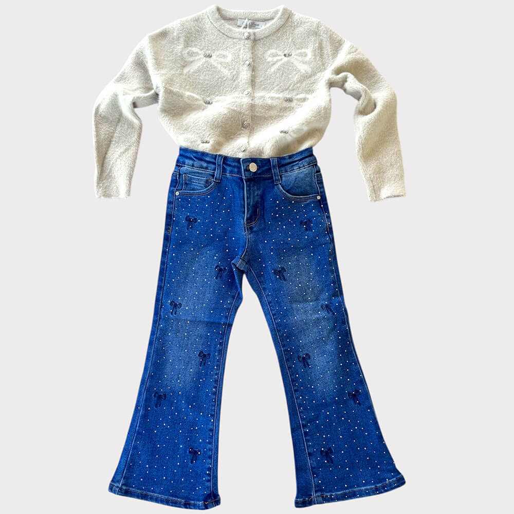 Το σετ “Bow Chic” είναι η τέλεια επιλογή για κορίτσια που αγαπούν το ρομαντικό αλλά και μοντέρνο στιλ. Το σύνολο περιλαμβάνει ένα κομψό λευκό πλεκτό με διακριτικά φιογκάκια και στρασάκια, συνδυασμένο με ένα μοναδικό τζιν καμπάνα με κεντήματα φιόγκους και διακοσμητικά στρας.