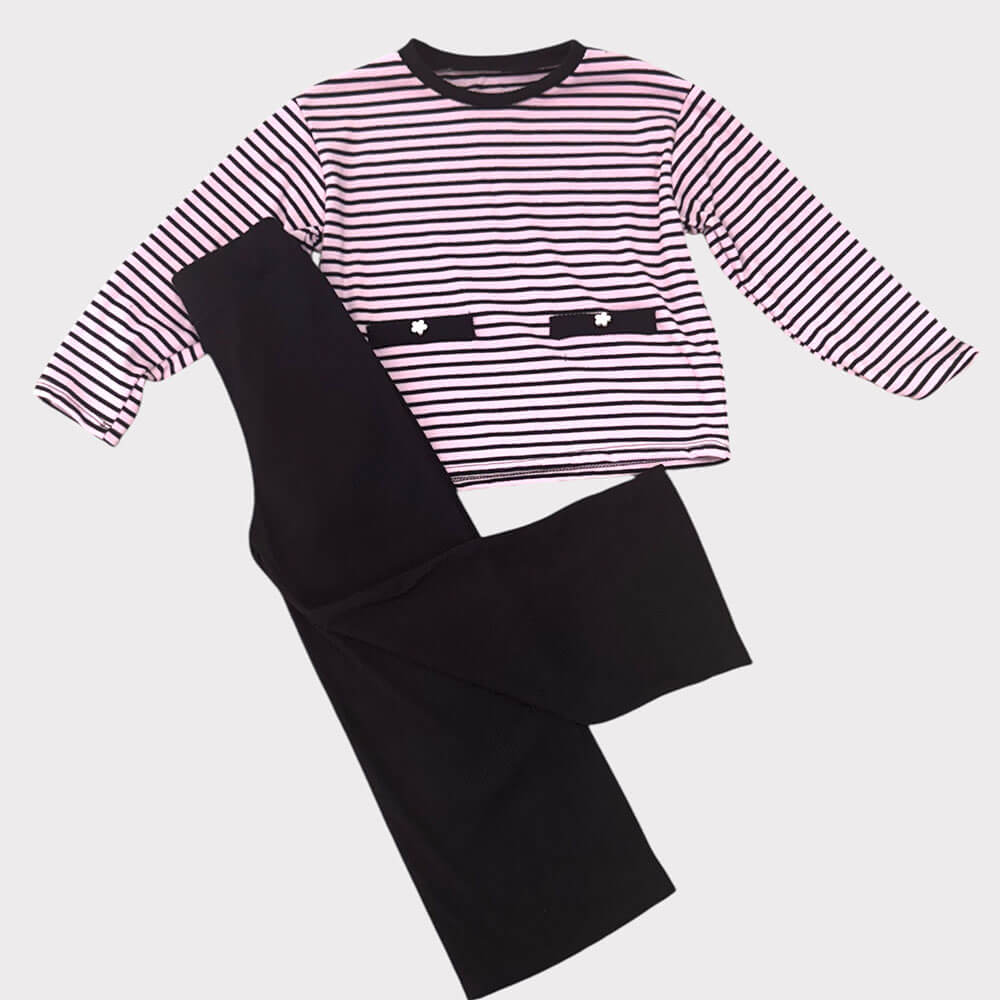 Σετ κορίτσι με ριγέ ροζ-μαύρη μπλούζα και μαύρο παντελόνι – άνετο και κομψό παιδικό ντύσιμο