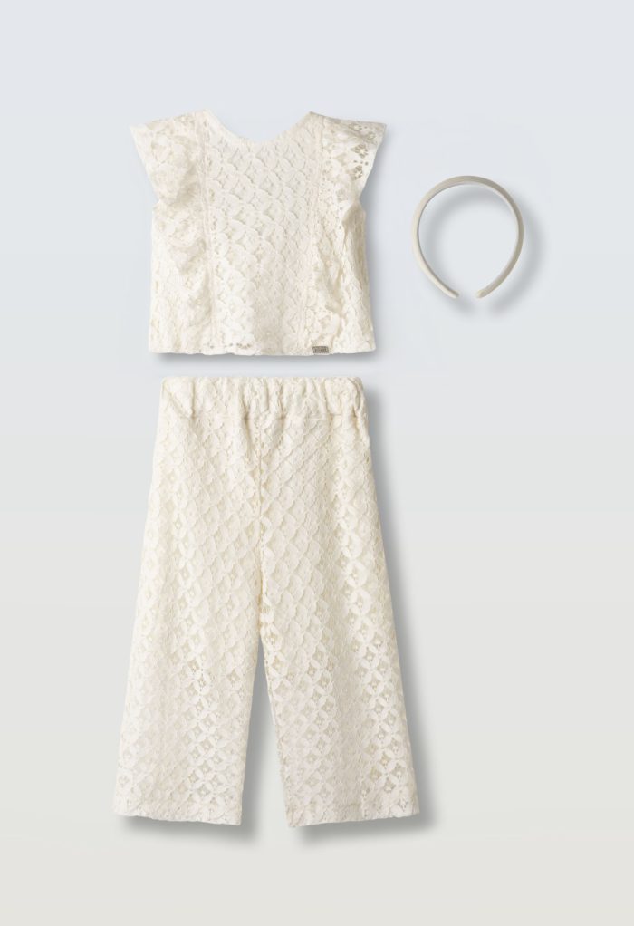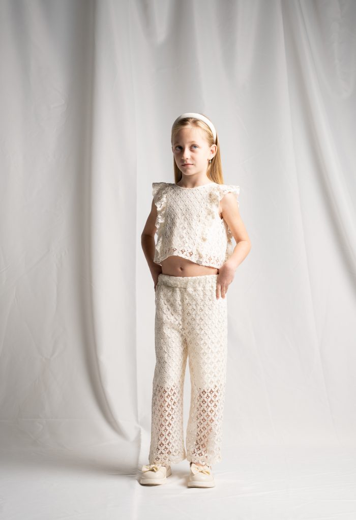 Το καλοκαιρινό σετ για κορίτσι σε εκρού απόχρωση με δαντέλα αποτελεί μια κομψή και ιδιαίτερη επιλογή για πιο ξεχωριστές εμφανίσεις. Το σετ περιλαμβάνει κοντό τοπ με διακριτικά βολάν στα μανίκια και παντελόνα σε άνετη γραμμή, δημιουργώντας ένα elegant και μοντέρνο σύνολο.