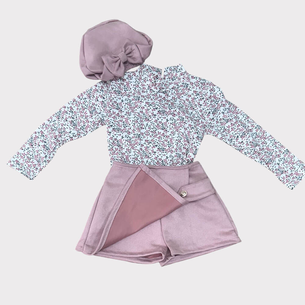 Σετ κορίτσι με φλοράλ μπλούζα, ροζ σορτς-φούστα και μπερέ με φιόγκο – ρομαντικό παιδικό ντύσιμο