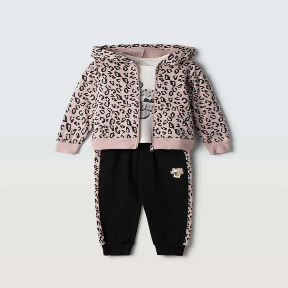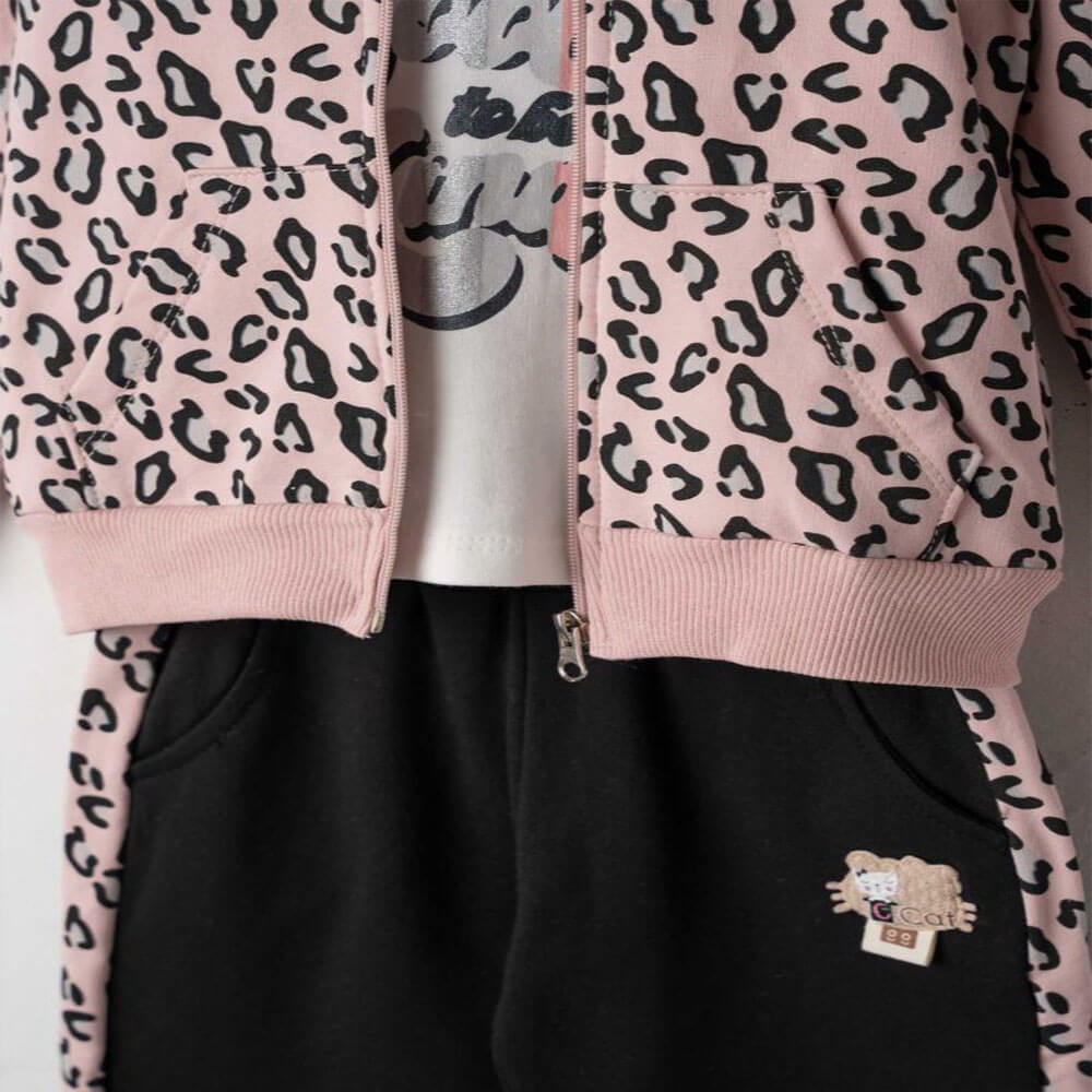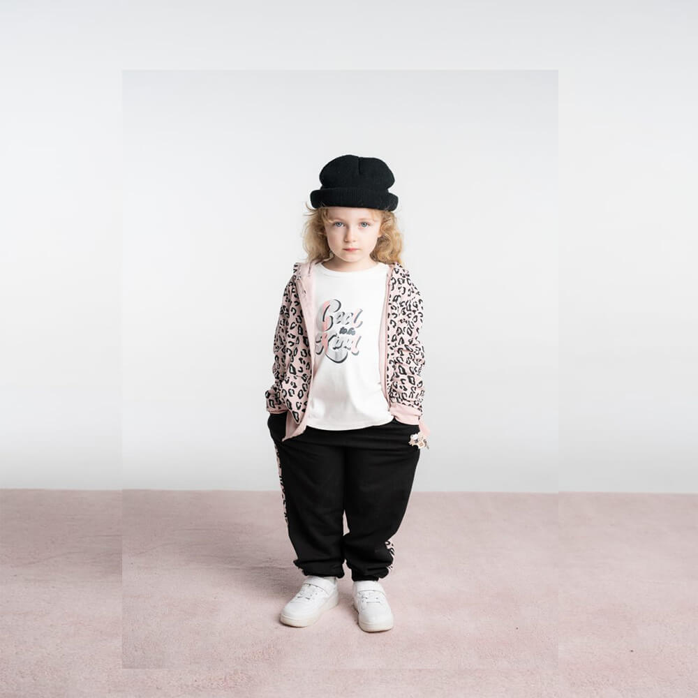 Το σετ “Wild Cool” είναι το απόλυτο outfit για κορίτσια που αγαπούν τη μόδα με urban και wild πινελιές! Αποτελείται από λευκή μπλούζα με μεταλλική στάμπα “Cool and Kind”, μαύρο παντελόνι φόρμας με ροζ animal print λεπτομέρειες στα πλαϊνά και ασορτί ζακέτα με κουκούλα και φερμουάρ. Ένα look που συνδυάζει άνεση και στυλ για κάθε μέρα.