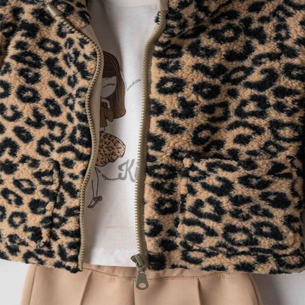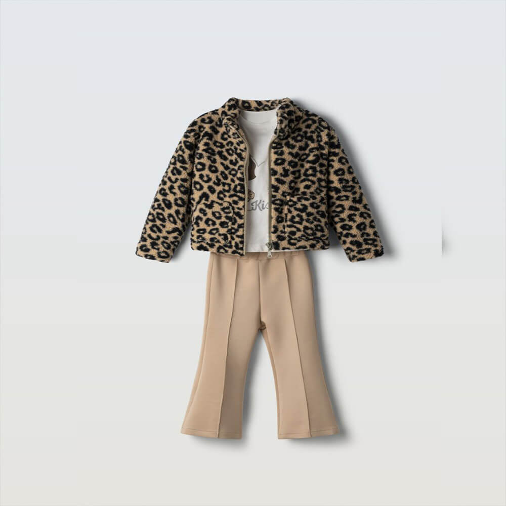 Το σετ “Wild Kiss” είναι ο τέλειος συνδυασμός στυλ και άνεσης για το φθινόπωρο και τον χειμώνα. Περιλαμβάνει αφράτο jacket με leopard print και φερμουάρ, λευκή μπλούζα με μοτίβο “Kiss” και κομψό παντελόνι καμπάνα σε ουδέτερο μπεζ τόνο. Ιδανικό για καθημερινές βόλτες, εκδρομές και σχολικές εμφανίσεις με fashionable διάθεση.